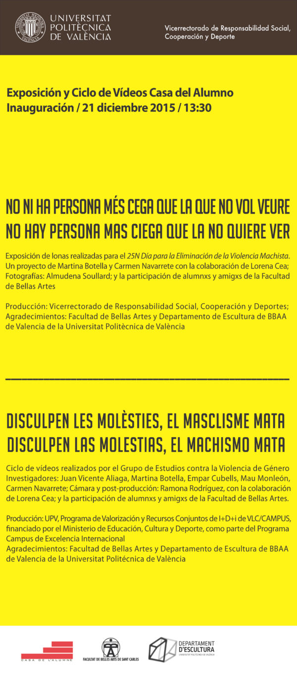 Series of videos made by the Study Group on Gender Violence Researchers: Juan Vicente Aliaga, Martina Bottle, Empar Cubells, Mau Monleón, Carmen Navarrete; Camera and post-producnuevo_25Nction: Ramona Rodriguez, with the collaboration of Lorenacnuevo_25N Cea; and participation amigxs alumnxs and School of Fine Arts.