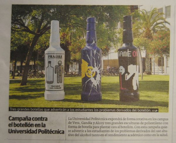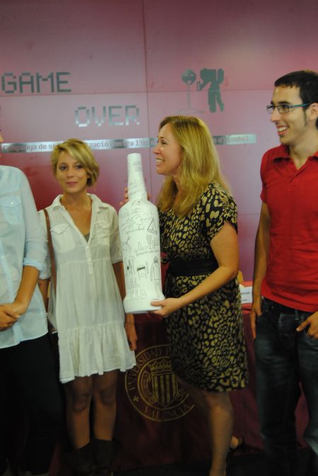 En este acto de presentación, que contó con la presencia de la Vicerrectora de Alumnado y Cultura, Mª Victoria Vivancos, y Antonio de Hoces, Delegado de Alumnos de la UPV, se pudieron apreciar las “botellas” ganadoras de la campaña original, “Planta cara al botellón”.
