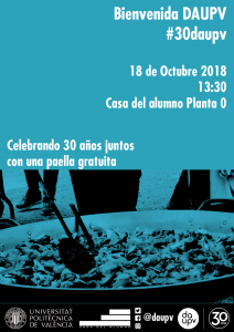Avui, dijous 18 d’octubre la Delegació d’Alumnes de la UPV ha celebrat els 30 anys de vida. L’acte tindrà lloc a la Casa de l’Alumne iniciant-se a les 12.30 amb unes paraules de José Luis Cueto, Vicerrector d’Alumntat, Cultura i Esport i Pablo Alcaraz, Delegat d’Estudiants. Al acte han asistit tant antics delegades i delegats com els actuals representants d’estudiants dels diferents centres de la universitat. Per a finalitzar l’event, es repartirà paella de verdura i de pollastre als assistents