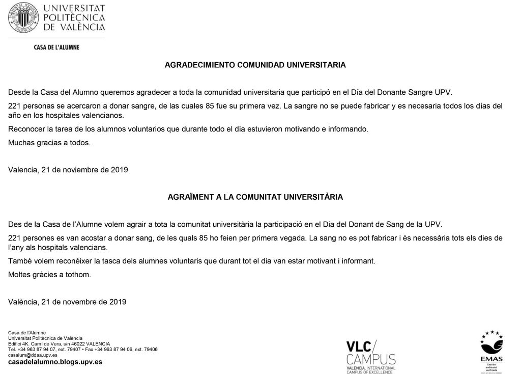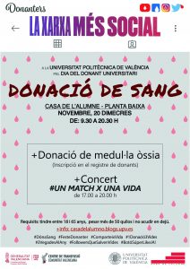 Next Wednesday 20 November as past years, the UPV and the Centre of Transfusion of the Valencian Community would like to invite all the university community to participate in blood donation.