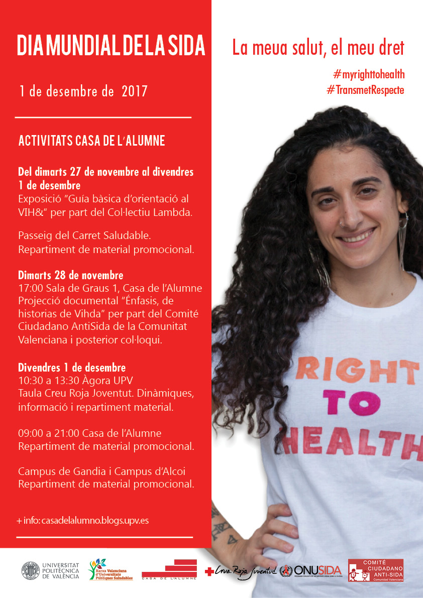 Sota el lema #TransmetRespecte i #myrighttohealth, La Casa de l’Alumne UPV va a realitzar diferents activitats per a informar a la comunitat universitària sobre els riscos i prevencions de les infeccions de transmissió sexual.